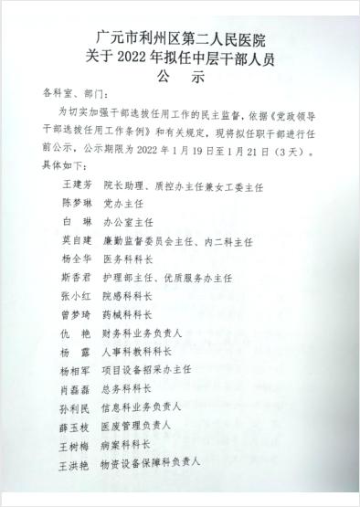 广元市利州区第二人民医院关于2022年拟任中层干部人员公示