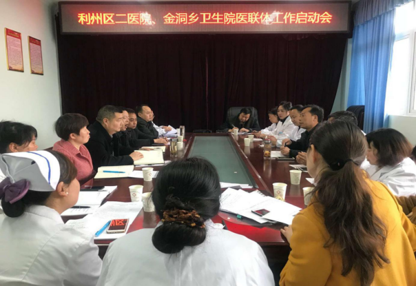 利州区第二人民医院党支部书记、院长张建波,副院长刘庭勇、贺明军及各职能科室负责人,金洞乡卫生院院长李泽义,副院长谢邦奎及部分职工代表参会。会议由区第二人民医院党支部书记、院长张建波主持。金洞乡卫生院院长李泽义就当前医院的基础设施、人才队伍、医疗资源、医院管理等方面与我院进行了深入交流。金洞乡卫生院部分职工也对当前医院就业环境、能力提升、辅检共享、基本公共卫生服务等工作提出想法。我院党支部书记、院长张建波同志分别就李泽义院长及金洞乡卫生院部分职工提出的想法逐一解答并提出,建设区医联体推进分级诊疗是我院进一步落实国家、省、市、区当前深化医药卫生体制改革的各项要求。我院将结合今天启动会上的实际情况制定具体帮扶计划。在我院优势医疗资源与较强医疗技术的基础上,资源共享、人才支持、技术支撑、基本公共卫生服务方面持续加大与金洞卫生院的合作力度,努力探索和建立更加紧密,更加牢固的医疗合作体系,为群众提供了更加安全、便捷、优质、价廉的医疗服务。